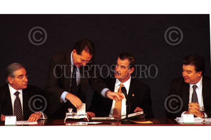 Vicente Fox y Rafael Macedo de la Concha conversan después de terminado el evento para prevenir adicciones. FOTO: Christian Palma/CUARTOSCURO.COM
