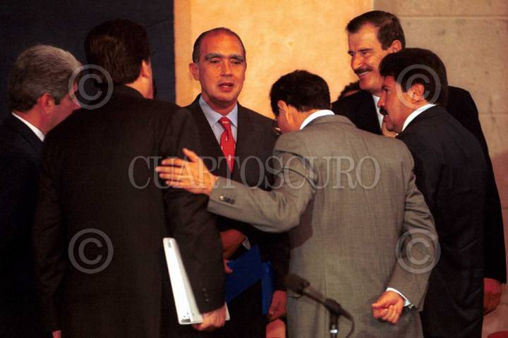 Vicente Fox y Rafael Macedo de la Concha conversan después de terminado el evento para prevenir adicciones. FOTO: Christian Palma/CUARTOSCURO.COM