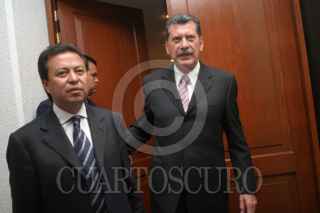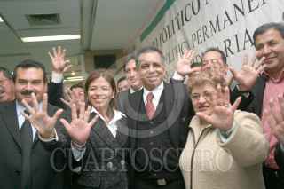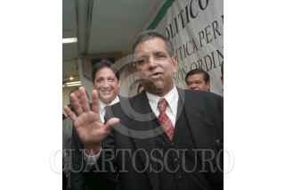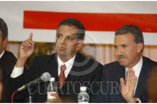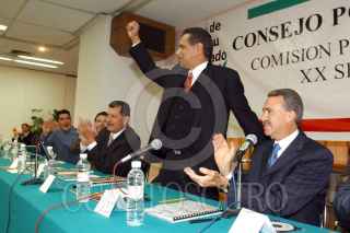 MEXICO D.F 12 NOVIEMBRE 2004.- Fidel Herrera, candidato electo a la gubernatura de Veracruz, festejó su triunfo durante los trabajos de la comisión permanente del consejo político nacional del PRI realizado en el CEN. A la derecha Roberto Madrazo Pintado, presidente del CEN, a la izquierda Enrique Jackson. FOTO:Juan Flores/CUARTOSCURO.COM