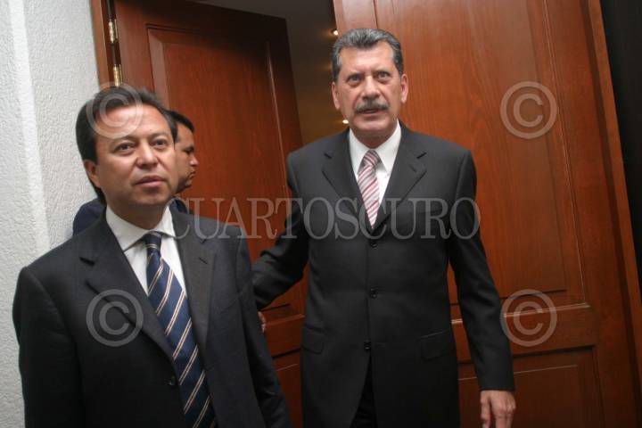 MEXICO D.F 12 NOVIEMBRE 2004.- Fidel Herrera, candidato electo a la gubernatura de Veracruz, festejó su triunfo durante los trabajos de la comisión permanente del consejo político nacional del PRI realizado en el CEN. A la derecha Roberto Madrazo Pintado, presidente del CEN, a la izquierda Enrique Jackson. FOTO:Juan Flores/CUARTOSCURO.COM