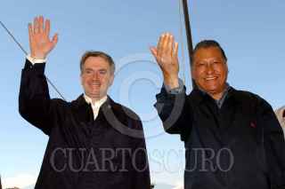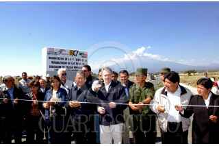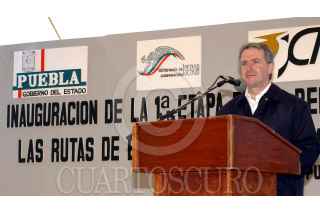 TIANGUISMANALCO, PUEBLA, 19NOVIEMBRE2004.- El Secretario de Gobernación, Santiago Creel y el Gobernador de Puebla, Melquiades Morales, en la inauguración de la primera etapa de rehabilitación de las rutas de evacuación del volcán Popocatepetl. FOTO: Javier Tapia/CUARTOSCURO.COM