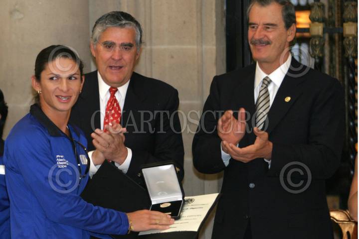 MEXICO, D.F. 20NOVIEMBRE2004.- Manlio Fabio Beltrones, presidente de la mesa directiva de la cámara de diputados, la atleta Ana Gabriela Guevara y el ministro Mariano Azuela durante la ceremonia de entrega del premio Nacional del Deporte 2004. FOTO: Nelly Salas/CUARTOSCURO.COM