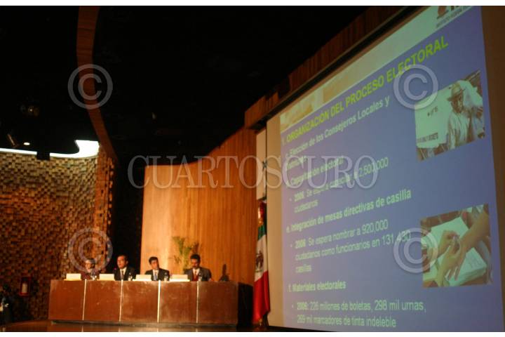 MEXICO, D.F. 05ENERO2005.- Alejandra Latapí, consejera ciudadana y Luis Carlos Ugalde, consejero presidente del IFE durante el foro acerca del voto de mexicanos en el extranjero y proceso para las elecciones del 2005-2006, en el auditorio de la secretaria de Relaciones Exteriores. FOTO: Sandra Perdomo/CUARTOSCURO.COM