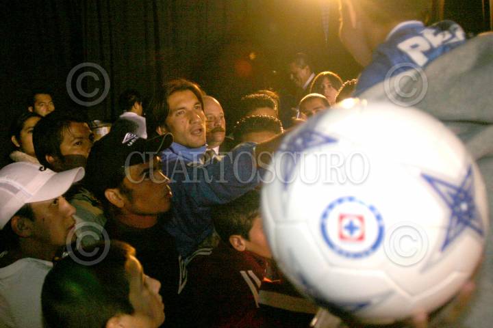 MEXICO D.F 12 ENERO 2004.- El jugador Fransisco "Kikin" Fonseca firma playeras a unos aficionados durante la presentaciòn de los nuevos uniformes del equipo del Cruz Azul. FOTO: Eunice Adorno/CUARTOSCURO.COM
