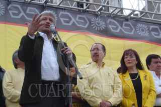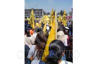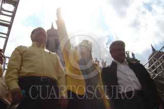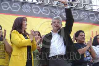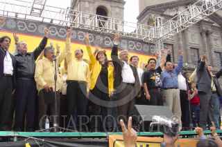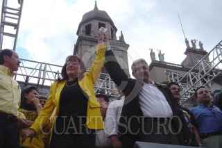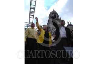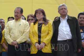 TOLUCA, EDO MEX 13FEBRERO2005.- Leonel Godoy, presidente nacional del PRD, Yeidckol Polevnsky, candidata a la gubernatura del Estado del PRD, y Andrés Manuel López Obrador, jefe de gobierno capitalino, en el inicio de la campaña de la ex presidente de la CANACINTRA a la gubernatura del Estado. FOTO: Noé Marure/DIARIO AMANECER