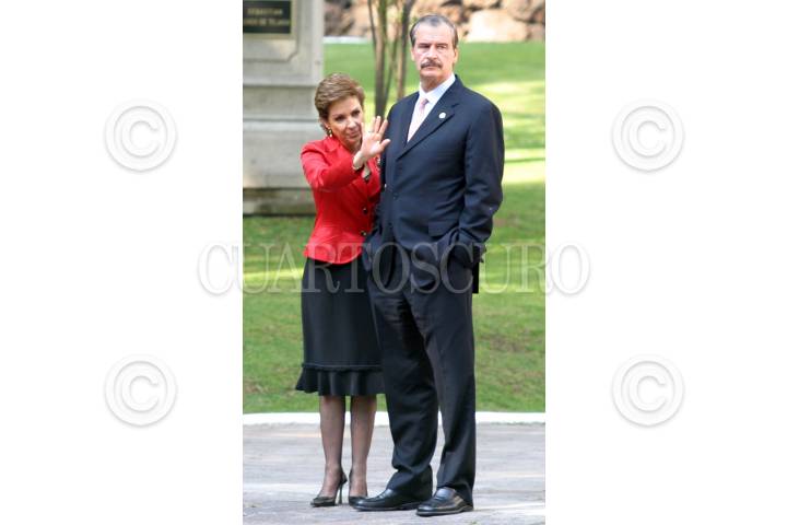 MEXICO, D.F. 22FEBRERO2005.- Wendy Widman, esposa de Oscar Berger, presidente de Guatemala, el presidente Vicente Fox y su esposa Marta Sahagún al término de la ceremonia realizada en la residencia ¨Miguel Aleman¨de Los Pinos. FOTO: Sandra Perdomo/CUARTOSCURO.COM