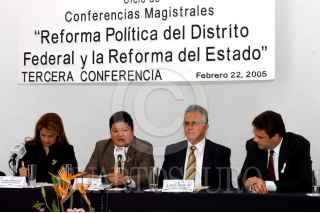 MEXICO, D.F. 22FEBRERO2005.- Los diputados Lorena Villavicencio, Carlos Reyes Gamiz, el vocero de la SEGOB, Gonzalo Altamirano Dimas, y José Espina, durante la conferencia magisterial ¨Reforma política del DF y la Reforma del Estado¨. FOTO: /CUARTOSCURO.COM