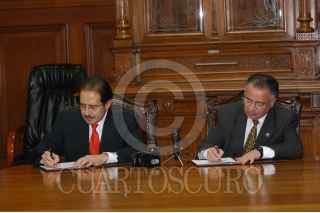 MEXICO, D.F. 22FEBRERO2005.- El presidente de la Suprema Corte de Justicia de la Nación, Mariano Azuela Güitrón y el secretario de la Función Pública Eduardo Romero Ramos, firmaron un convenio de colaboración en materia de transparencia y combate a la corrupción. FOTO: Victor Hugo Ortiz/CUARTOSCURO.COM