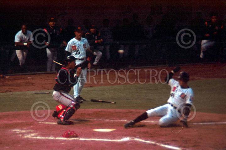 Manuel Valdez, receptor de los Tigres Capitalinos, se barre a home para anotar la carrera número 12 de la quinta entrada. Foto: David Bolaños/Cuartoscuro