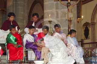 OAXACA, OAXACA 24MARZO2005.- El arzobispo de catedral, José Luis Chávez Botello, durante la ceremonia del lavatorio de pies a los pequeños apostoles en este jueves santo. FOTO: Blanca Esthela Hernández/CUARTOSCURO.COM
