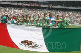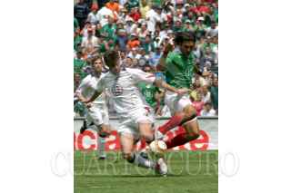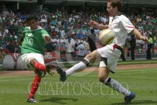 MEXICO, D.F. 27MARZO2005.- Salvador Carmona (México) protege el balón ante la llegada de Patrick Noonan (E.U.A:) en el partido de la continuación del hexagonal de la eliminatoria mundialista CONCACAF Copa del Mundo Alemania 2006 en el estadio Azteca donde México venció dos goles a uno a los Estados Unidos. FOTO: Iván Stephens/CUARTOSCURO.COM
