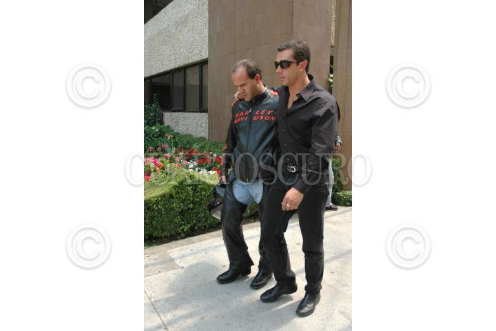 MEXICO, D.F. 05MAYO2005.- Sergio Mayer a su salida de la conferencia realizada en el hospital ángeles donde el actor y cantante Egdar Ponce murió luego de que esta madrugada sufrió un accidente el elenco de Sólo para mujeres cuando grababa un videoclip de su espectáculo. En primer plano el productor Guillermo del Bosque. FOTO: Iván Stephens/CUARTOSCURO.COM