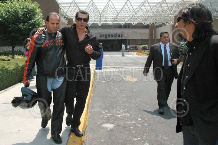 MEXICO, D.F. 05MAYO2005.- Sergio Mayer a su salida de la conferencia realizada en el hospital ángeles donde el actor y cantante Egdar Ponce murió luego de que esta madrugada sufrió un accidente el elenco de Sólo para mujeres cuando grababa un videoclip de su espectáculo. En primer plano el productor Guillermo del Bosque. FOTO: Iván Stephens/CUARTOSCURO.COM