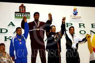 VILLAHERMOSA, TABASCO 05MAYO2005.- Se celebró la premiación de las medallas a los participantes en la diciplina de Karate de la X Olimpiada Nacional, donde la rama varonil para los tercer lugares fue para Jesús Medina de Coahuila y Arturo Torres de la UNAM, segundo lugar; Jaime Medel de Michoacán y el primer lugar lo ocupó Alonso Uscanga del Instituto Politécnico Nacional (IPN). FOTO: Marco Polo Guzmán/CUARTOSCURO.COM