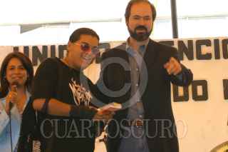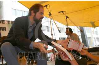 MEXICO, D.F. 07MAYO2005.- El escritor Juan Villoro firma algunos ejemplares de sus obras, que fueron entregados a jóvenes, como parte de un programa que tiene como objetivo el fomento a la lectura. FOTO: Nelly Salas/CUARTOSCURO.COM