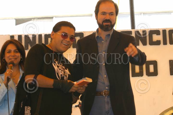 MEXICO, D.F. 07MAYO2005.- El escritor Juan Villoro firma algunos ejemplares de sus obras, que fueron entregados a jóvenes, como parte de un programa que tiene como objetivo el fomento a la lectura. FOTO: Nelly Salas/CUARTOSCURO.COM