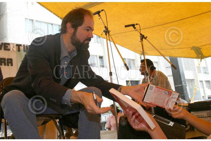 MEXICO, D.F. 07MAYO2005.- El escritor Juan Villoro firma algunos ejemplares de sus obras, que fueron entregados a jóvenes, como parte de un programa que tiene como objetivo el fomento a la lectura. FOTO: Nelly Salas/CUARTOSCURO.COM