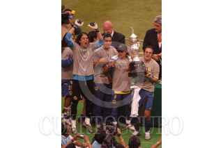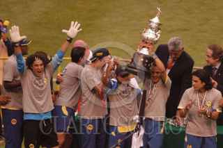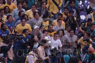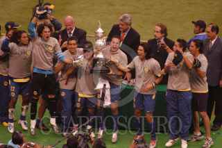 MEXICO D.F.29MAYO2005.- En el estadio azteca, Las Aguilas del América conquistó su décimo campeonato en el fútbol mexicano, al imponerse 6-3 a Tecos de la UAG, en la final del torneo Clausura 2005. Cuauhtemoc Blanco capitàn del Club América muestra el trofeo de campeón a la afición americanista. FOTO: Germán Romero/CUARTOSCURO.COM