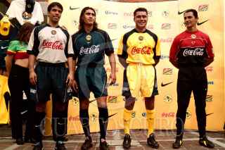 Esta mañana el equipo de futbol América presento sus nuevos uniformes a los medios de comunicación. Fabian Estay posa con sus comapñeros de equipo. FOTO: Alberto Valdez/CUARTOSCURO.COM