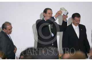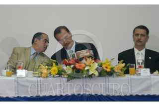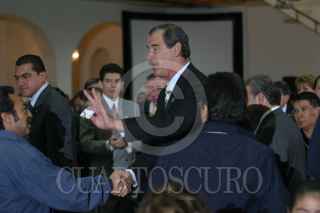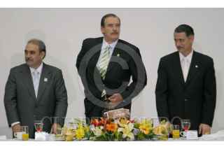 MEXICO, D.F. 17JUNIO2005.- Guillermo Vela, secretario general de la Unión de expendedores y voceadores de los periodicos, el presidente Vicente Fox y Carlos Abascal, secretario deGobernación durante la ceremonia conmemorativa del XII aniversario del Día del Voceador que se llevo a cabo en el Campo Marte. FOTO: Nelly Salas/CUARTOSCURO.COM