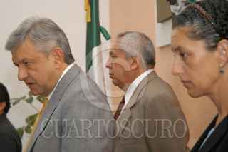 MEXICO, D.F. 21JUNIO2005.- El jefe de gobierno Andrés Manuel López Obrador,el secretario de transporte y vialidad del Distrito Federal Francisco Garduño Yañez y la secretaria de medio ambiente del DF Claudia Sheinbaum durante la conferencia matutina en el antiguo palacio del ayuntamiento. FOTO: Miguel Dimayuga/CUARTOSCURO.COM