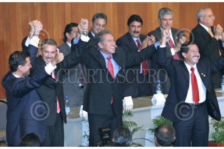 MEXICO, D.F. 12JULIO2005.- Los Priístas Enrique Peña Nieto, Roberto Madrazo, Arturo Montiel y Ney González celebran las victorias tricolores en el estado de México y Nayarit durante la sesión del consejo político. FOTO: Miguel Dimayuga/CUARTOSCURO.COM
