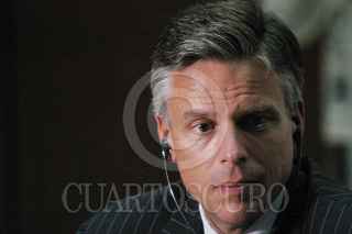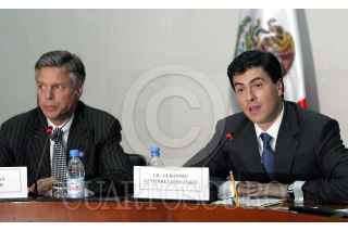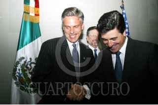 MEXICO, D.F. 13JULIO2005.- John Huntmann, gobernador del estado norteamericano de Utah y el sub secretario de relaciones exteriores Gerónimo Gutierrez Fernández al termino de la conferencia de prensa conjunta impartida en las instalaciones de la SRE. FOTO: Miguel Dimayuga/CUARTOSCURO.COM