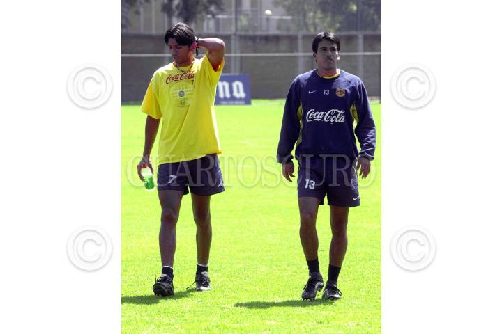 Franky Oviedo y Pavel Pardo, al término del entrenamiento de la Aguilas en sus instalaciones de Coapa. FOTO: Pedro Mera/CUARTOSCURO.COM