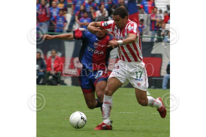 MEXICO, D.F. 20AGOSTO2005.- Diego Martínez, jugador de los Rayos del Necaxa y Javier Peña, de Atlante, sostienen una discusión durante el partido de la jornada 4 del torneo de apertura 2005 en el que Atlante venció 2 goles a 1 a los rayos del Necaxa. FOTO: Nelly Salas/CUARTOSCURO.COM