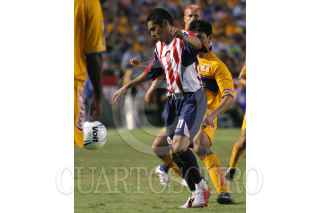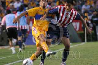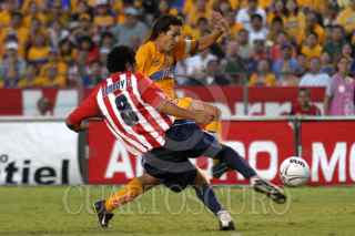 MONTERREY, N.L. AGOSTO2005.- Antonio Sancho(arriba) de Tigres se quita la marca de Johnny Garcia(abajo) de Chivas durante el partido de la jornada 4, realizado en el estadio Universitario de esta ciudad, con un marcador final de Tigres 1-1 Chivas. FOTO: Jorge López/CUARTOSCURO.COM