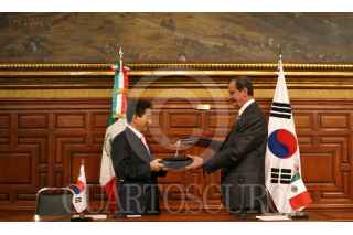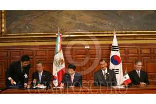 MEXICO, D.F. 09SEPTIEMBRE2005.- Roh Moo Hyun presidente de la República de Corea y el presidente Vicente Fox al termino de la firma de acuerdos comerciales entre ambas naciones. FOTO: Nelly Salas/CUARTOSCURO.COM