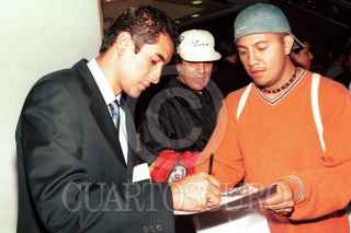 El atlista Miguel Zepeda reparte autógrafos a los aficionados que se percatan de la salida de los seleccionados a Cali, Colombia para su participación en la Copa América. FOTO:Oswaldo Ramírez/CUARTOSCURO.COM