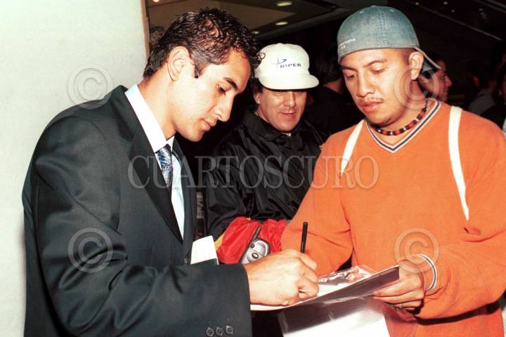 El atlista Miguel Zepeda reparte autógrafos a los aficionados que se percatan de la salida de los seleccionados a Cali, Colombia para su participación en la Copa América. FOTO:Oswaldo Ramírez/CUARTOSCURO.COM