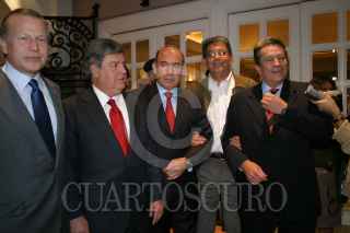 MEXICO, D.F. 13OCTUBRE2005.- Manuel Angel, exgobernador de Hidalgo, Albores Guillen, exgobernador de Chiapas, Juan S. Millan, exgobernador de Sinaloa y Alfredo del Mazo, exgobernador del Estado de México a su salida de la reunión que sostuvieron en un hotel de la ciudad de México. FOTO: Nelly Salas/CUARTOSCURO.COM