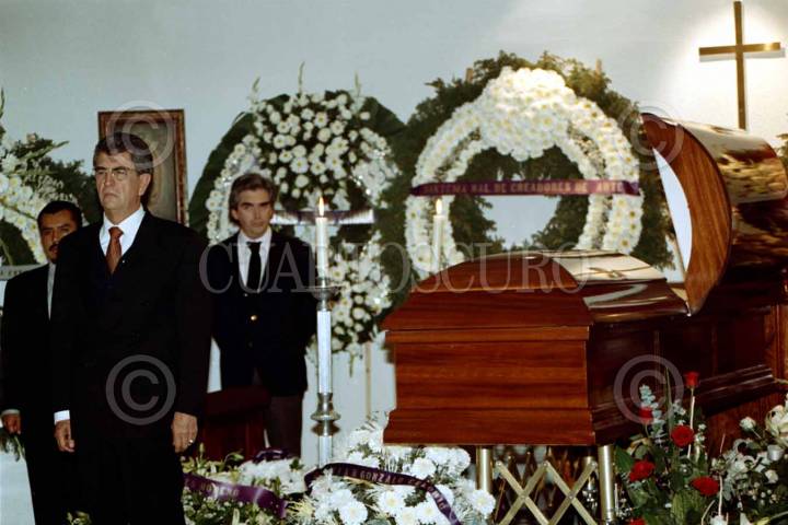 El secretario de Educacion Miguel Limon Rojas y Rafael Tovar y de Teresa directpor de CONACULTA realizan una guardia ante el cuerpo de Fernando Benitez distinguido periodista y escritor quien fallecio esta mañana de un paro cardiaco.