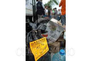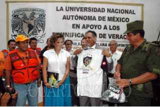 VERACRUZ,VERACRUZ.-17OCTUBRE2005.- Del total de 162 toneladas de ayuda que la UNAM destinó a los damnificados de Chiapas y Veracruz, 50 fueron entregadas a autoridades estatales para su canalización. La ayuda fue entregada por María Elena Llarena, directora de protección civil de la UNAM y recibió el Gobernador Fidel Herrera Gobernador del Estado. FOTO: Isaac Aguilar/CUARTOSCURO.COM