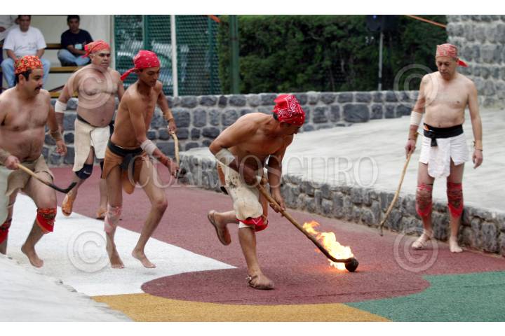 MEXICO, D.F., 17OCTUBRE2005.- Se realizó la inauguración de una cancha de juego de pelota prehispánico en el Museo Nacional de Antropología. En la imagen una desmostración de Ulama en Tregua por parte de Miguel Montoya Camacho. FOTO: Moisés Pablo/CUARTOSCURO.COM
