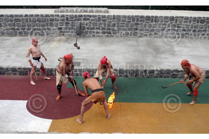 MEXICO, D.F., 17OCTUBRE2005.- Se realizó la inauguración de una cancha de juego de pelota prehispánico en el Museo Nacional de Antropología. En la imagen una desmostración de Ulama en Tregua por parte de Miguel Montoya Camacho. FOTO: Moisés Pablo/CUARTOSCURO.COM