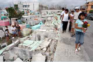 CANCUN , QUINTANA ROO 02NOVIEMBRE2005.- La barda y diversas tumbas del pateon municipal fueron destruidos por el huracan ¨Wilma¨, decenas de familias visitan a sus fieles difuntos entre los escombros del cementerio durante la celebracion de dia de muertos. FOTO: Amaranta Prieto/CUARTOSCURO.COM