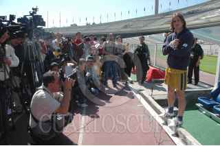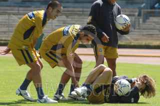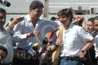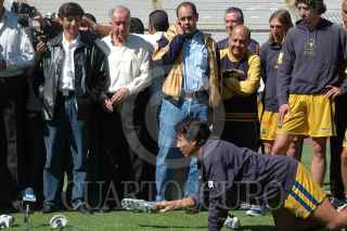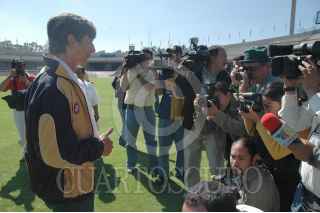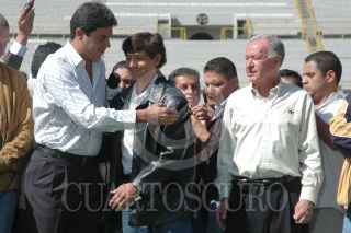 MEXICO, D.F. 02NOVIEMBRE2005.- Arturo Elías Ayud, presidente del patronato del Club Universidad le da la bienvenida a Miguel España, quien fue presentado como director técnico de los Pumas de la UNAM. A la derecha Aarón Padilla, presidente del Consejo Técnico Deportivo de los pumas de la UNAM. FOTO: Iván Stephens/CUARTOSCURO.COM