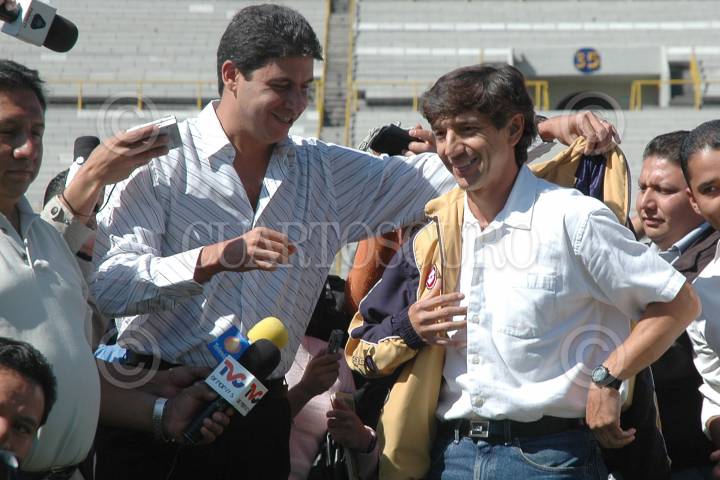 MEXICO, D.F. 02NOVIEMBRE2005.- Arturo Elías Ayud, presidente del patronato del Club Universidad le da la bienvenida a Miguel España, quien fue presentado como director técnico de los Pumas de la UNAM. A la derecha Aarón Padilla, presidente del Consejo Técnico Deportivo de los pumas de la UNAM. FOTO: Iván Stephens/CUARTOSCURO.COM