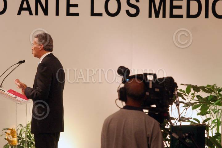 MEXICO, D.F., 03OCTUBRE2005.- Everardo Moreno y Roberto Madrazo Pintado, precandidatos priistas a la presidencia, realizaron un debate ante los medios de comunicación en el auditorio Plutarco Elìas Calles del CEN nacional del PRI. FOTO: Moisés Pablo/CUARTOSCURO.COM