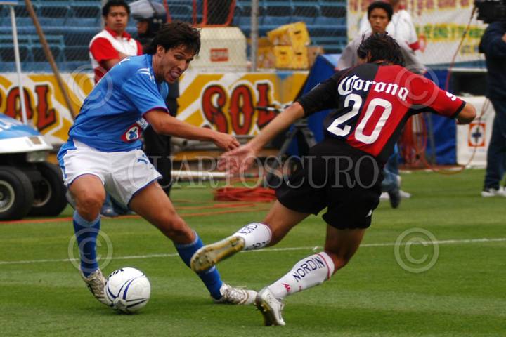 MÈXICO, D.F. 28ENERO2006.- Rogelio Chávez del Cruz Azul y José Andrés Guardado del Atlas disputan el balon durante el partido de la segunda jornada del torneo de Clausura 2006 en el que empataron a un gol ambas escuadras. FOTO:Miriam Sànchez/CUARTOSCURO.COM