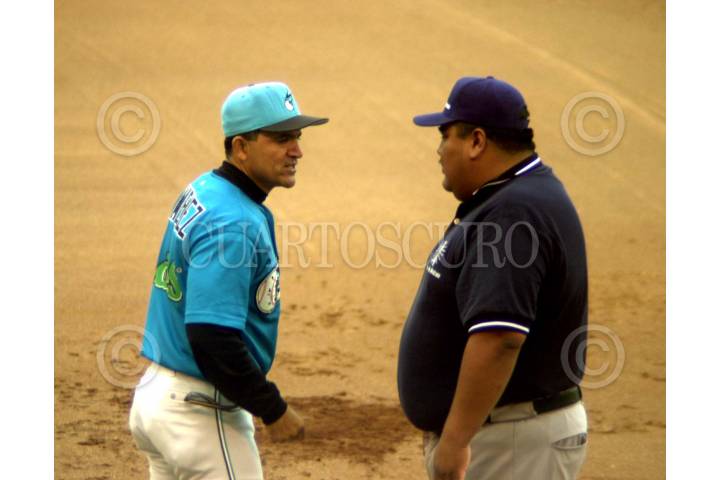 El Scout de los Saraperos de Saltillo encara al ampaller de primera base ante una desición apretada en la que marca out, en el segundo juego de la serie ante los Tigres Capitalinos. FOTO: David Bolaños/CUARTOSCURO.COM