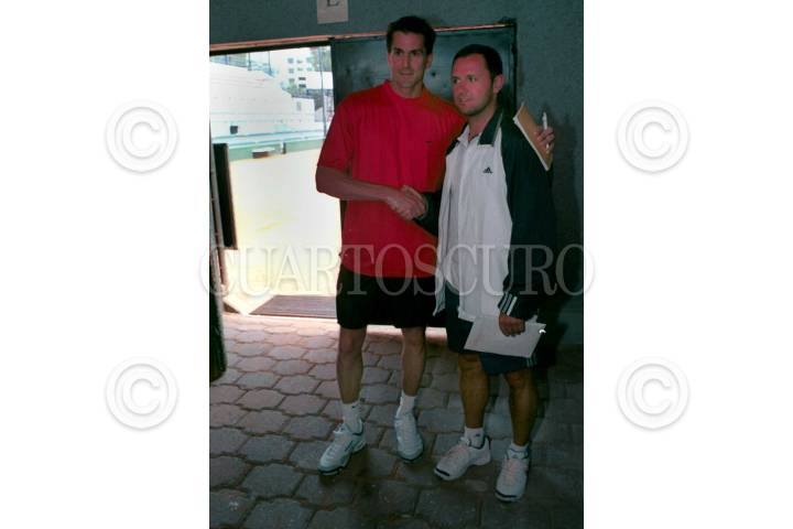 El capitan canadiense Martín Laurendeau desea suerte a su similar mexicano Oliver Fernández a dos dias de iniciar la Serie Copa Davis en el Deportivo Chapultepec. FOTO:Oswaldo Ramírez/CUARTOSCURO.COM
