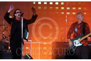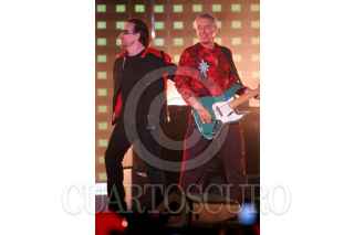 MEXICO D.F. 16FEBERO2006.- El cantante Bono junto con el bajista Adam Clayton, durante el primer concierto que ofreciò la banda irlandesa U2, en el Estadio Azteca. FOTO: CUARTOSCURO.COM
