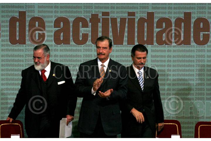 MEXICO, D.F., 22FEBRERO2006.- Vicente Fox, Presidente de la Republica y Carlos María Abascal, Secretario de Gobernación, durante el informe de labores 2005 del titular de la CNDH, en los Pinos. FOTO: Diego Gallegos/CUARTOSCURO.COM