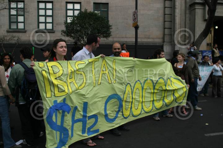 MEXICO D.F. 22MARZO2006.- Decenas de personas marcharon por las calles del centro historico. Los manifestantes exigen el libre derecho del agua y rechazan la privatización del vital liquido. Un niño toma un globo que representa las gotas de agua que salen de una toma de agua. FOTO: Nelly Salas/CUARTOSCURO.COM