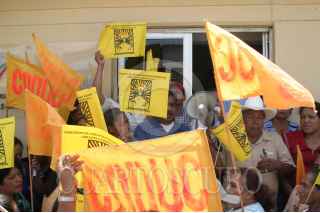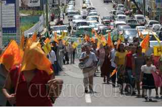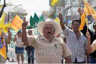 VILLAHERMOSA, TABASCO 10ABRIL2006.- Alrededor de tres centenares miembros de la Coalición de Organizaciones Democráticas Urbanas y Campesinas se manifestaron sobre principales avenidas para realizar reclamos en la falta de regularización de sus predios, con lo que lograron provocar un caos vial para posteriormente plantarse en las instalaciones de la SAGARPA. FOTO: Marco Polo Guzman/CUARTOSCURO.COM