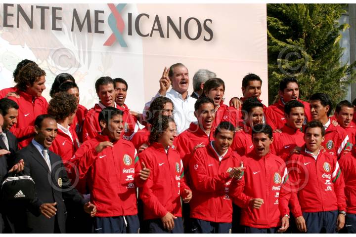MEXICO, D.F., 09MAYO2006.- Vicente Fox Quesada, Presidente de la República saluda a Jesús "El Cabrito¨Arellano, jugador del Tricolor, durante el abanderamiento de la Selección Mexicana que participará en Mundial de Fútbol en Alemania, en la residencia oficial de los Pinos. FOTO: Moisés Pablo/CUARTOSCURO.COM